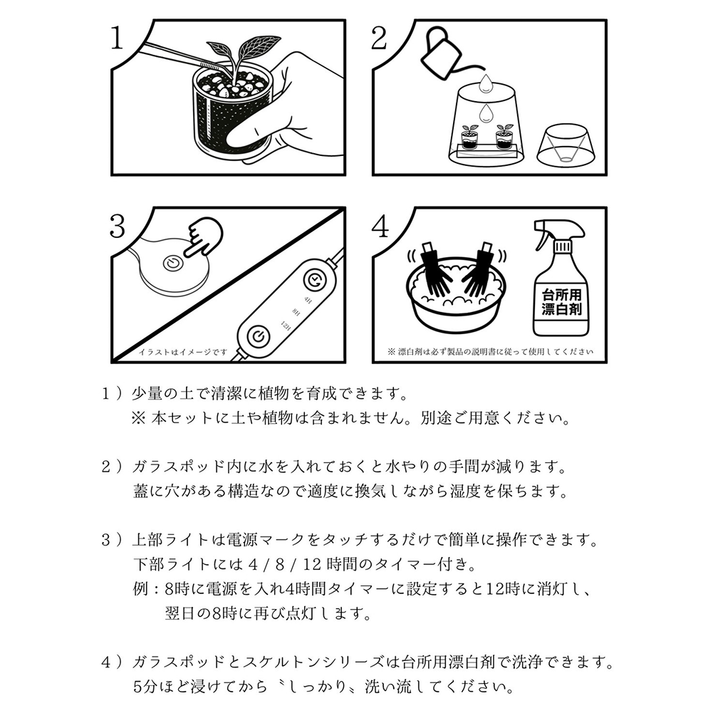 スケルトンプランターは少量の土で植物を育てられるため、清潔かつ手軽に楽しめます。